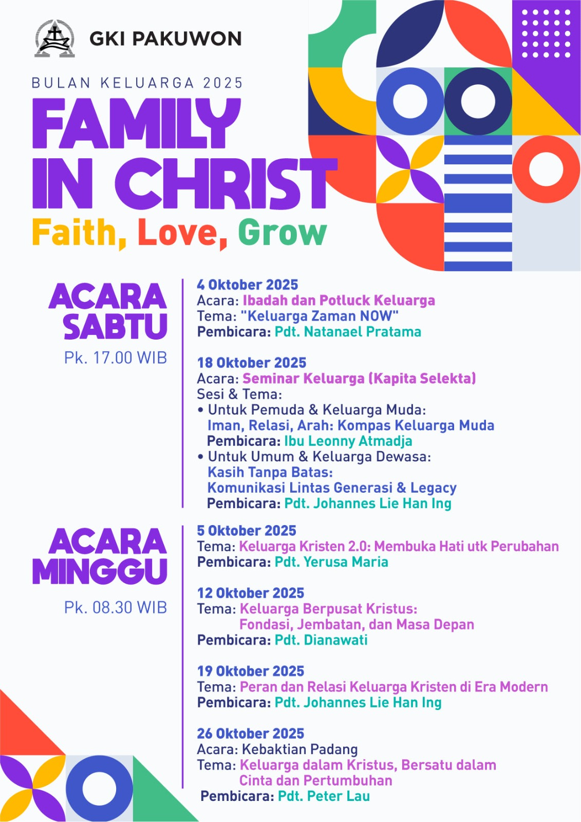 | Tema Ibadah | Peran dan Relasi Keluarga Kristen di Era Modern | Keluarga dalam Kristus, Bersatu dalam Cinta dan Pertumbuhan | ||